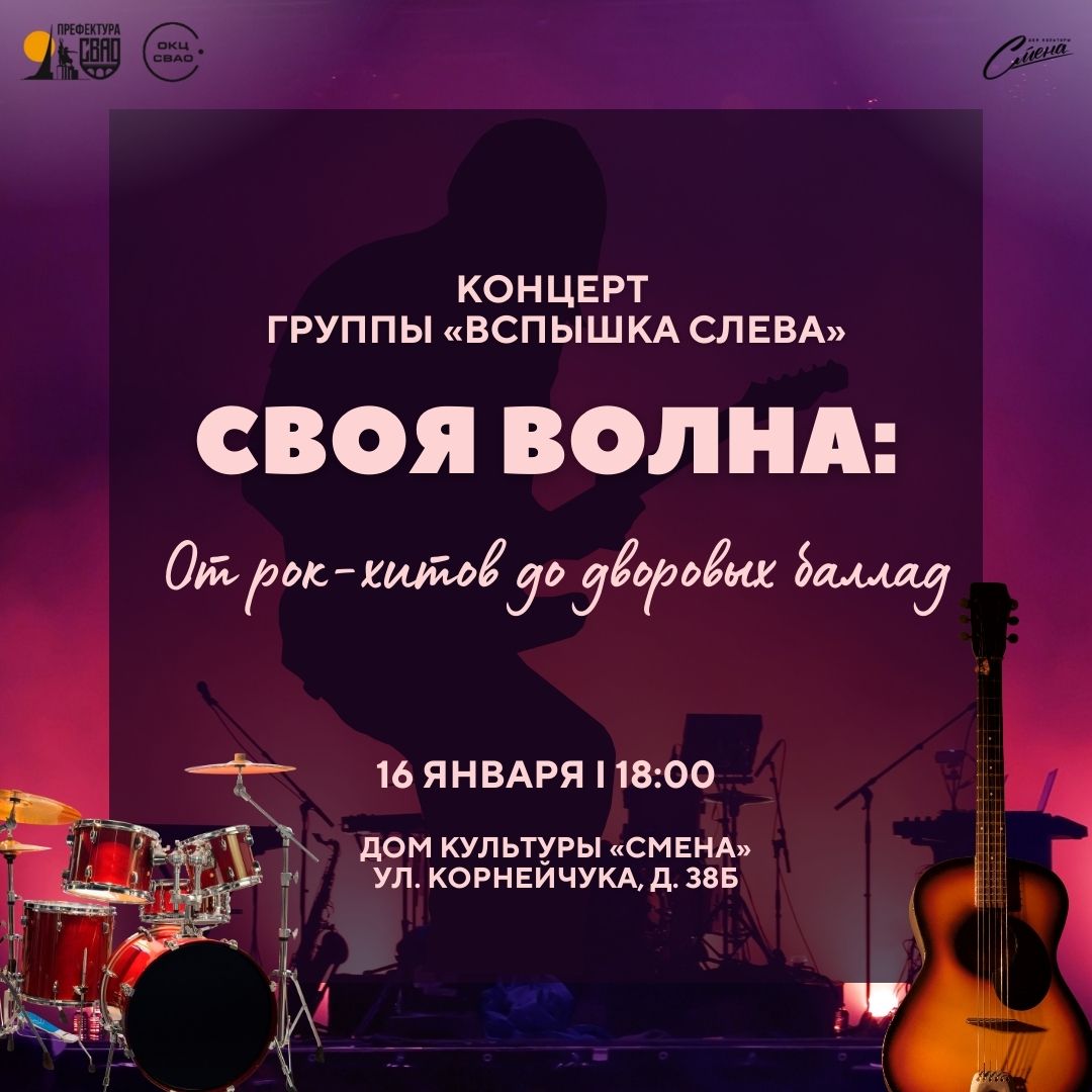 Дом культуры «Смена» 16 января в 18.00 приглашает всех ценителей живой музыки и настоящего рока на громкое событие сезона — сольный концерт молодой, дерзкой и талантливой группы «Вспышка слева». Этот вечер станет уникальным творческим обращением, где энергия легендарных хитов встретится с искренностью и свежим звучанием собственного материала.