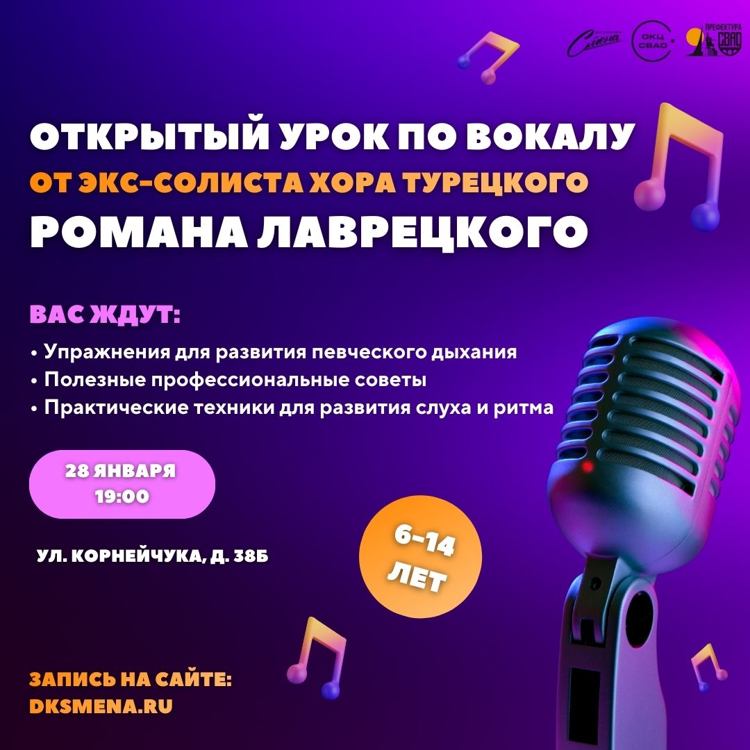 Дом культуры «Смена» приглашает детей 6–14 лет на уникальный открытый урок от настоящего мастера — экс-солиста легендарного «Хора Турецкого», Романа Лаврецкого. Роман Викторович, основатель детской вокальной студии «Талантум», совмещает двадцатилетний сценический опыт с десятилетней практикой работы с детскими голосами. Этот час станет ярким знакомством с миром профессионального пения, где важны не только техника, но и радость творчества.