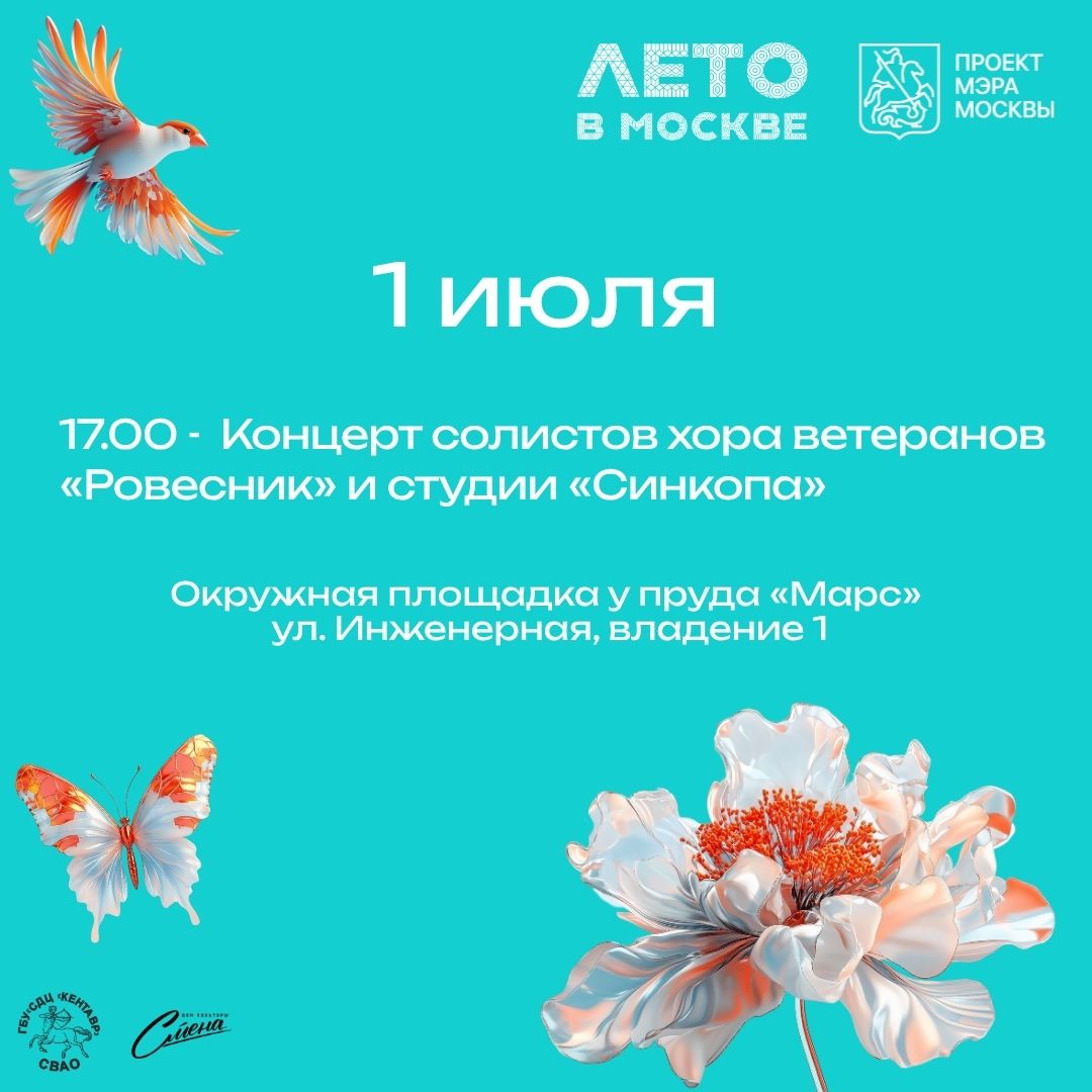 Завтра, 1 июля в 17:00, приглашаем вас на Окружную площадку у пруда «Марс» — в рамках проекта «Лето в Москве» состоится концерт солистов хора «Ровесник» и студии «Синкопа».