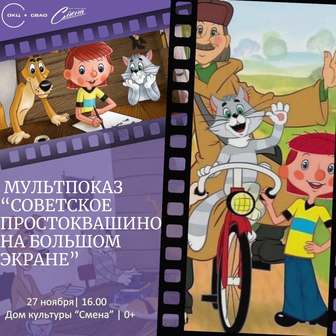 Приглашаем вас и ваших близких окунуться в атмосферу любимого советского мультфильма! На большом экране мы покажем все три серии знаменитой трилогии о приключениях кота Матроскина, дяди Фёдора, Шарика и других обитателей Простоквашино.