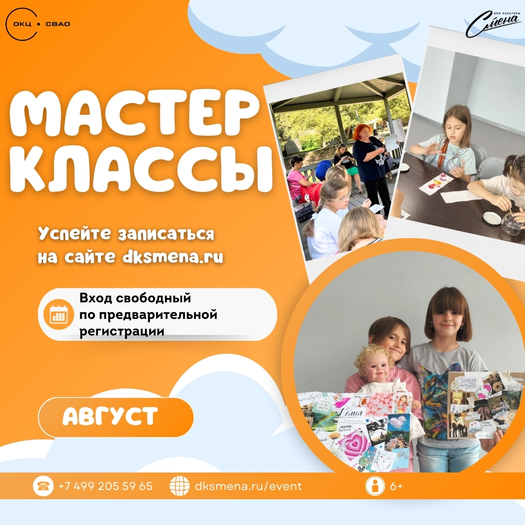Лето ещё не закончилось, и в ДК «Смена» мы приготовили для вас множество увлекательных мастер-классов для детей! Вас ждут занятия по рисованию, декоративно-прикладному творчеству и многое другое. Это отличная возможность провести время с пользой, раскрыть фантазию и создать что-то своими руками.